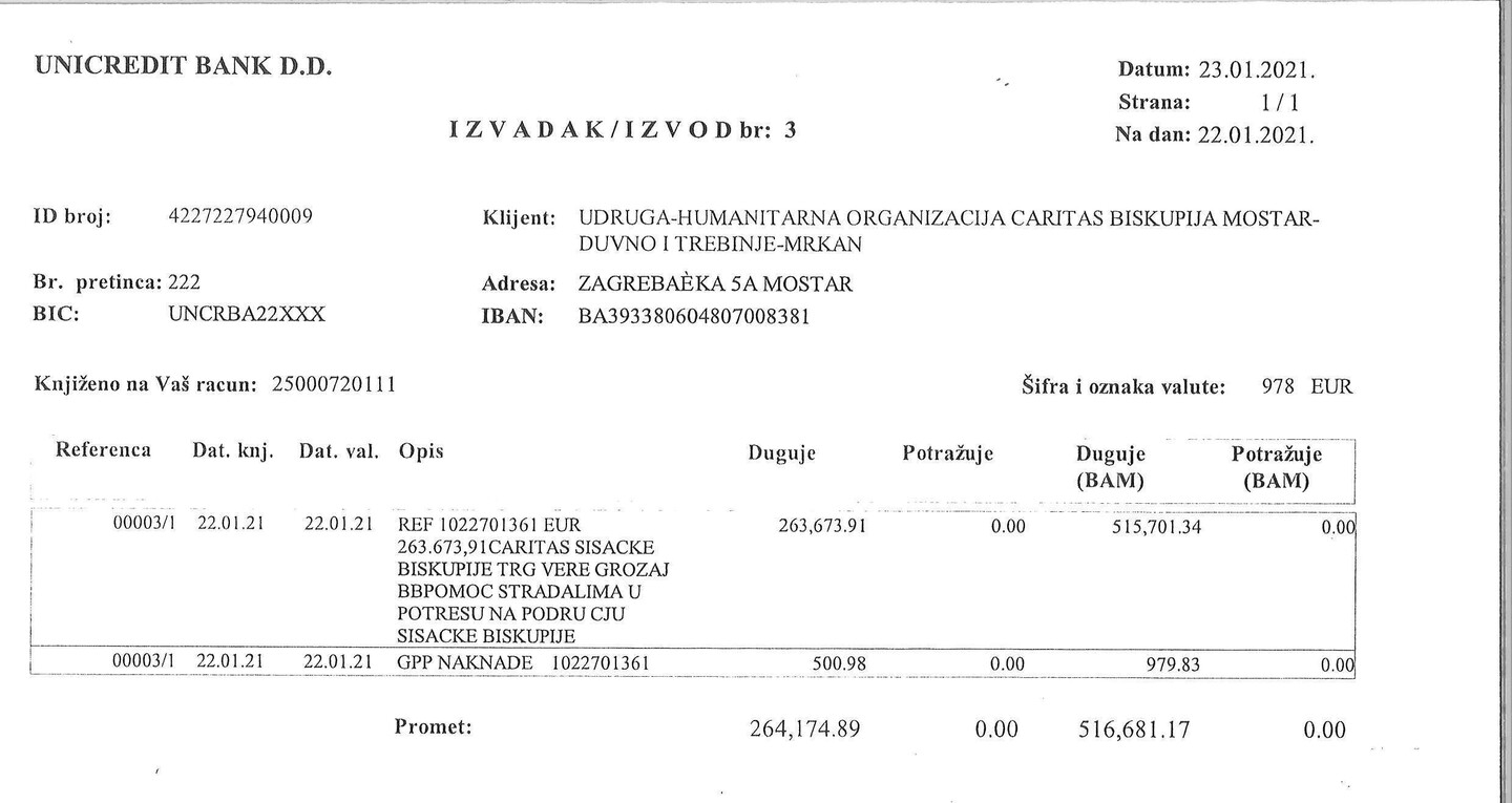 15.1.2021. | Hrvatski dom Herceg Stjepan Kosača Mostar | 500,00 |