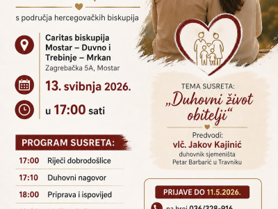 U prostorijama Caritasa biskupija Mostar–Duvno i Trebinje–Mrkan, na adresi Zagrebačka 5A, u organizaciji Caritasova Obiteljskog centra, 13. svibnja 2026. godine održat će se tradicionalni duhovni susret za bračne parove s područja hercegovačkih biskupija.
